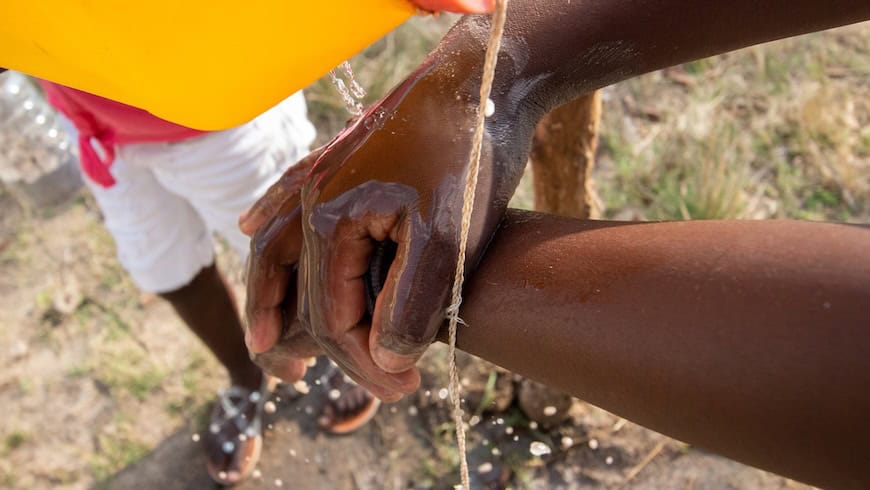 Hand washing alternative called tippy tap made of 5 liter water gallon and a string, supported by two tree logs